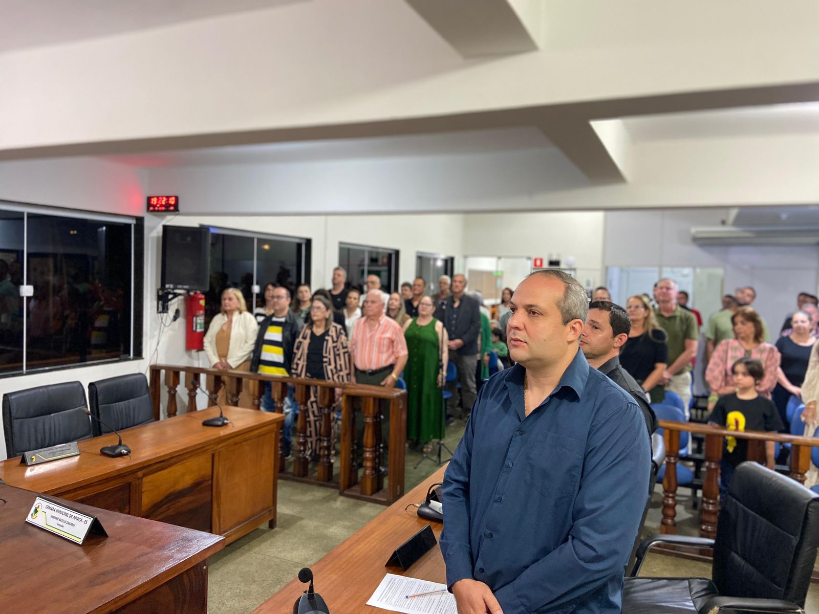 Dando continuidade à Sessão, após a composição da mesa principal foram entoados o Hino Nacional e o Hino Municipal. Posteriormente, o Pastor Rivaldar Gomes da Primeira Igreja Batista de Apiacá fez uma breve oração para dar início a Sessão Solene de Posse.