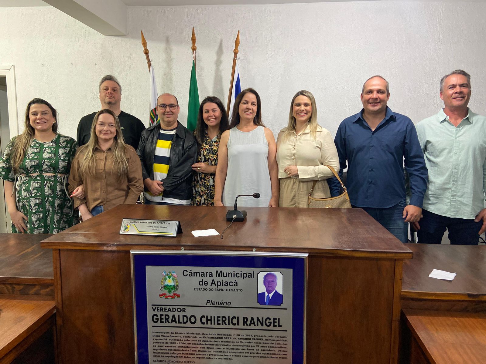 No dia 20 de julho do corrente ano, o Poder Legislativo Municipal realizou Sessão Solene, a fim de conferir os Títulos de Cidadão Apiacaense e Moção de Aplauso a diversas personalidades, que estão direta e indiretamente contribuindo para o bem-estar e a melhoria de nosso Município, além de participarem de diversas atividades que integram a nossa comunidade, sempre com o espírito altruísta de colaborar com os nossos munícipes. A mesa diretora foi composta por 5 dos 9 vereadores da casa legislativa. Presidida pelo vereador Cláudio Luiz Moreira Chierici, contou com a presença do Prefeito Municipal Fabrício Gomes Thebaldi e demais autoridades presentes. Receberam o Título de Cidadão Apiacaense; o Sr. Carlos Vinícius Queiroz Goulart, gerente administrativo da Agência Banestes em Apiacá; o Sr.Júlio Cesar Rezende Filho, que admitido no Banestes em 1980 já atuou nas agências de Muqui, Mimoso do Sul e Apiacá e Excelentíssimo Doutor Evandro Coelho Lima, Juiz de Direito da Comarca de Apiacá desde fevereiro de 2015. Na ocasião também foi realizada entrega da Moção de Aplauso, concedida ao Excelentíssimo Dr. Veraldo Macedo Miranda, natural de Apiacá atua desde 17 de abril de 1985 como Promotor de Justiça da Comarca de Apiacá-ES. Ao término da Sessão Solene, homenageados e convidados participaram de uma recepção preparada pela Câmara. img