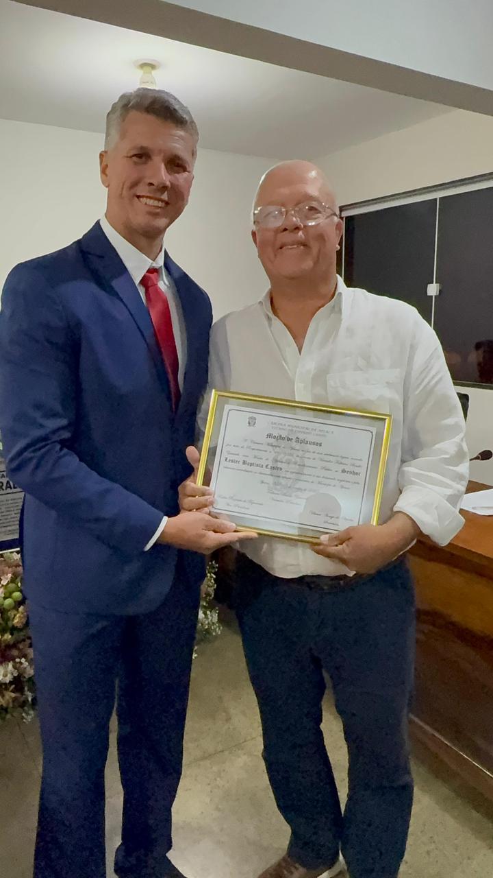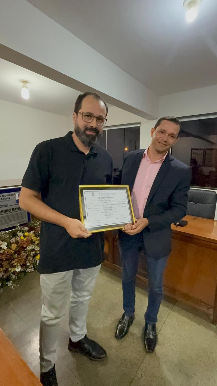 O Desembargador Doutor Fábio Clem de Oliveira, recebeu das mãos do Vereador Ivanildo Mendes de Oliveira o Título de Cidadão Apiacaense e das mãos do Prefeito Fabrício Gomes Thebaldi, a medalha de mérito apiacaense.