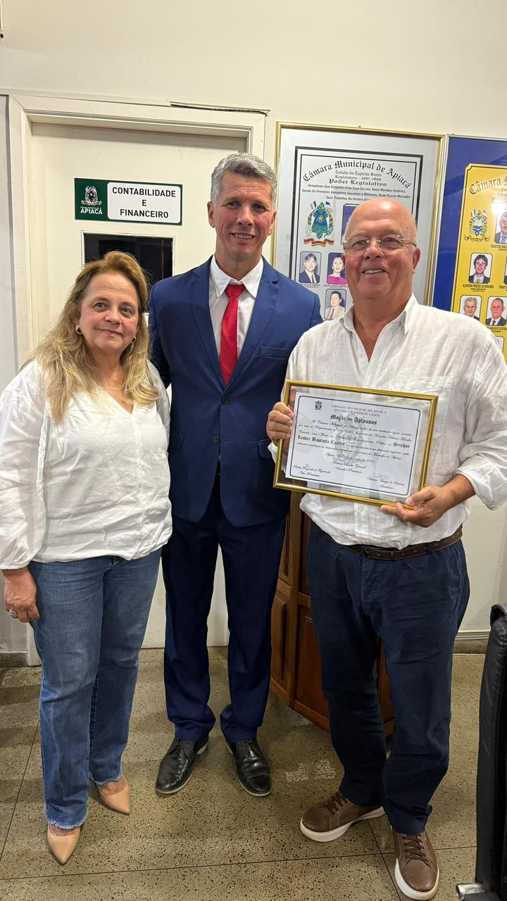 A Câmara Municipal de Vereadores de Apiacá realizou no dia 16 de dezembro, Sessão Solene para conferir os Títulos de Cidadão Apiacaense e Moção de Aplauso a diversas personalidades, que estão direta e indiretamente contribuindo para o bem-estar e a melhoria de nosso Município, além de participarem de diversas atividades que integram a nossa comunidade, sempre com o espírito altruísta de colaborar com os nossos munícipes.